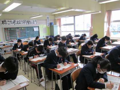 学校運営委員の皆さまをはじめとする地域の方にご協力いただいて実施しています。100名を超える生徒が受験し、真剣に立ち向かっています。地域運営学校として軌道にのった活動になりました。