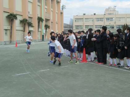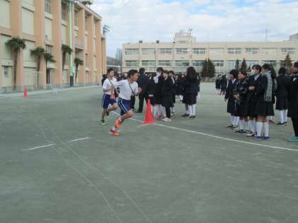 2年生が体育でとりくんだ持久走のまとめとして、クラス対抗駅伝大会を行いました。選手のがんばりだけでなく、クラスの代表を応援する姿勢も立派で、とても盛り上がった大会となりました。