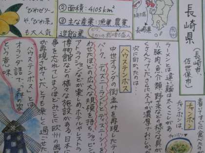 自分が決めた都道府県に仮想旅行して、新聞にまとめるという課題です。それぞれの創意工夫が見られ、とても楽しい展示になっています。ご来校の際にぜひご覧ください。