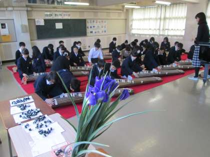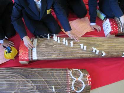 和楽器琴の演奏に挑戦しています。ゲストティーチャーの方々からアドバイスされながら、琴の調べを響かせています。心が和みますね。