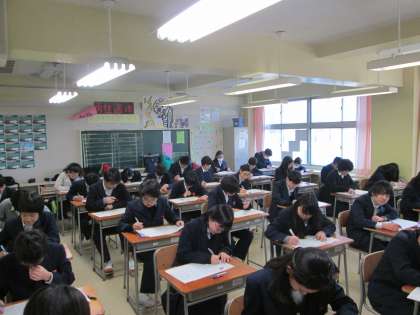 本日は、国語と音楽の2教科です。2年生の国語では、聞き取りテストが行われています。ひと言も聞き逃すまいと、集中力を研ぎ澄ましています。