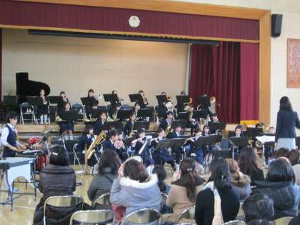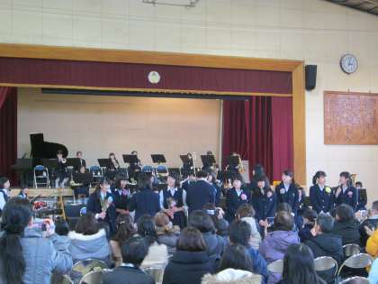 第5回目となった定期演奏会が体育館で行われました。3年生と一緒に演奏するのも本日で最後となります。総勢40名を超える部員による迫力のある演奏が9曲披露されました。卒業を迎える3年生には、後輩から花束の贈呈があり、感動的なフィナーレとなりました。ご来場いただいた保護者・地域の皆さま、ありがとうございました。