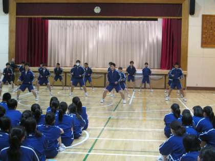 教科「日本語」表現領域でことばと文化について学習しました。その学習で理解したことをふまえて、外国文化を継承するダンスを創作する活動を体育の授業で行いました。集団でダンスを創作する活動を通して、よりよい集団のあり方について考える場とすることを目指しました。本日はいよいよ発表会です。男子は、ニュージーランド・マオリ族に伝わる「ハカ」を披露しました。女子は現代的なリズムのダンスを創作しました。独創性のある工夫された演技に魅了された1時間となりました。
