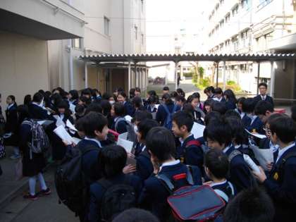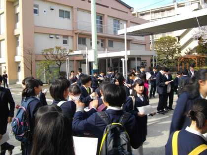 桜がまだ咲きほこる晴天の中、平成28年度1学期始業式が行われました。生徒は登校すると新しいクラス名簿を受け取り、これから1年間共に学ぶ新しい級友、担任の先生を確認して歓声をあげていました。この日は遅れて登校するものもなく8時30分から始業式が行うことができました。