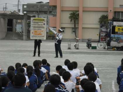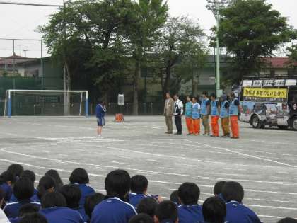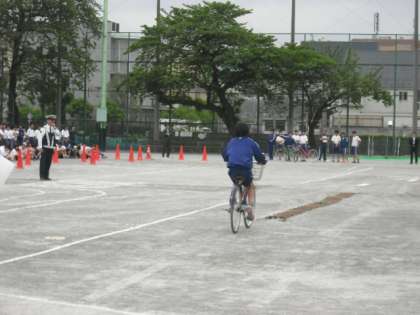 後半は成城警察署の指導の下、自転車実技教室を行いました。代表生徒9名がスラローム、傘を持ってのS路走行、悪路、一本橋走行を体験しました。交通事故の被害者にも加害者にもならないために必要なことを学ぶ事ができました。