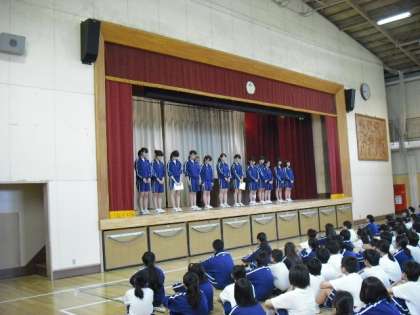 5月11日の全校朝礼。5/9〜27まで教育自習に来ている実習生2名の紹介がありました。保健体育科と技術家庭科の教員をめざしている大学4年生です。実習に望む抱負をそれぞれ述べていました。