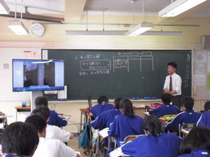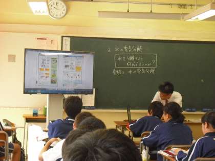 2年生は理科で水の電気分解を学習しています。前時に行った実験を教室の大型TVで振り返りながら考察しまとめていきました。