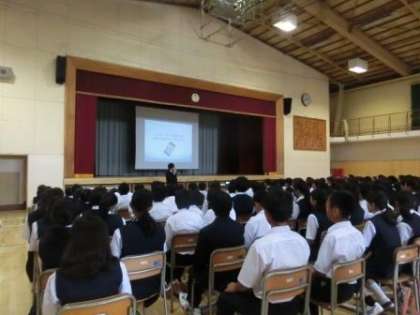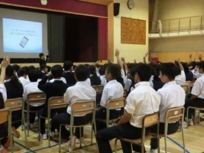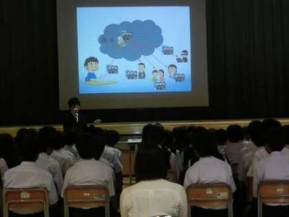 一年生を対象にネットリテラシー醸成講座が本校体育館で行われました。生徒一人一人が真剣にネット社会の功罪に耳を傾けていました。今後利用するとき、気を付けていこうと気持ちを持つことができました。