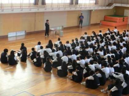 3年生の生徒にむけての「進路説明会」が行われ、進路選択・決定にむけてみな真剣なまなざしで話しを聞いていました。また、1学年集会では学年委員中心で考えたプロジェクトを発表しました。