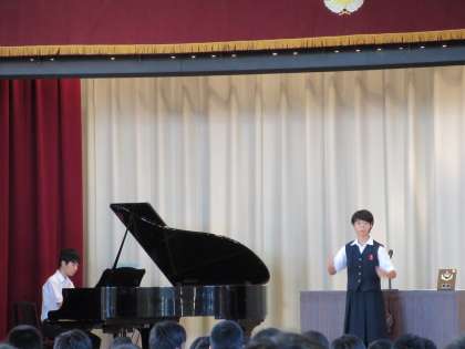 9月1日、夏休み中の転出入があり、595名で始業式を迎えました。大人数が集まるとは思えないほど短時間にスムーズに集合できました。私語もなく厳粛な雰囲気の中で、校歌斉唱、校長講話と始業式が行われました。多くの生徒が良い夏休みを送ることができ、また一つ成長したことが窺われました。