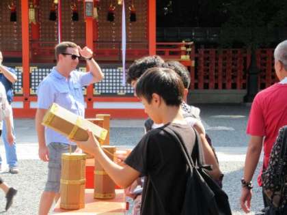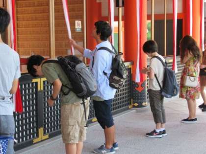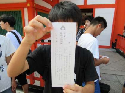 チェックポイントの1つである伏見稲荷大社です。昨日「らくたび」の講演会で復習した神社のお参りの仕方を早速実行していました。おみくじの「大大吉」を引き当てた子もいました。