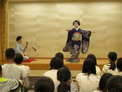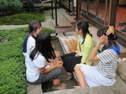 二日目の宿舎は聖護院御殿荘です。ここは修学旅行で使用する旅館の中でも格式ある旅館の1つです。宿舎に着いた時に提供される日本庭園を眺めながらの足湯は疲れを癒してくれます。夜は舞妓さんに来てもらい、踊りを鑑賞しました。