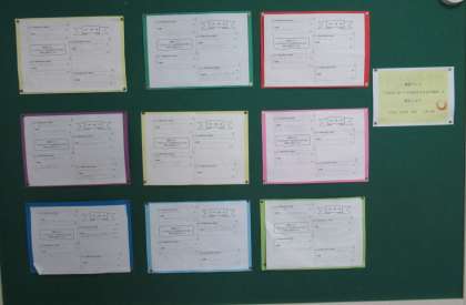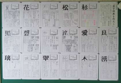 1年生廊下には、国語で学習している「漢字辞典を作ろう」で各自が選び調べた漢字一字をまとめたものを掲示しています。