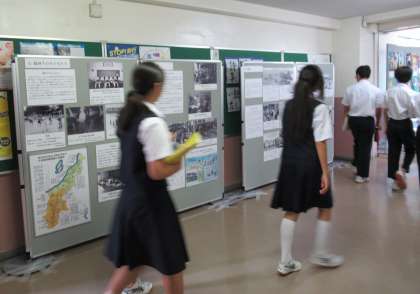 また、南北校舎の渡り廊下には、世田谷区の「平和資料中学校巡回展」が13日から27日まで展示されています。学校にお寄りの際はぜひご覧ください。