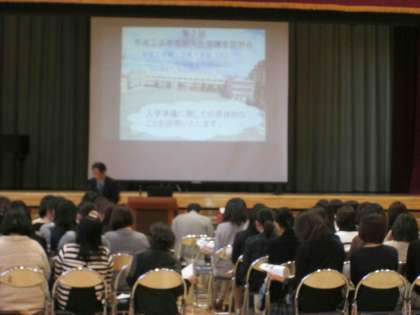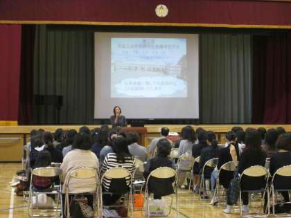 学校公開期間にあわせて、新入生保護者説明会を、校長挨拶に続き、本校の教育課程、生活指導、進路学習そして保健関係の説明を行いました。みのりの学び舎関係小学校他、近隣小学校の保護者合わせて119名の参加がありました。
