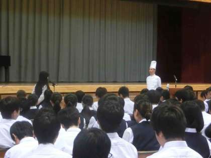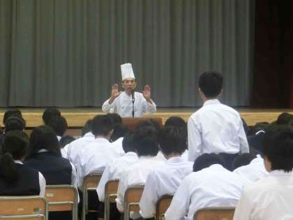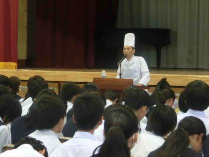 2年生対象に、職場体験先のキッチンマカベ「料理長 兵藤 智 様」をお招きして、「働く人の話しを聞く会」を開催いたしました。何事も大変ではあるが、その中で楽しさを探たり、そのことを好きになったりすること。また、職場体験では「あいさつ・返事」が大切であることなど仕事に取り組む心構えのみならず人生観についてお話しをいただきました。