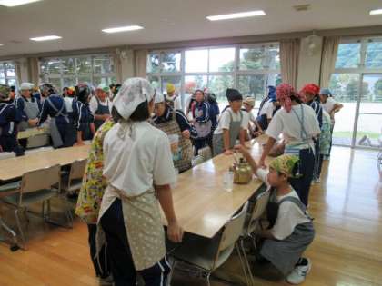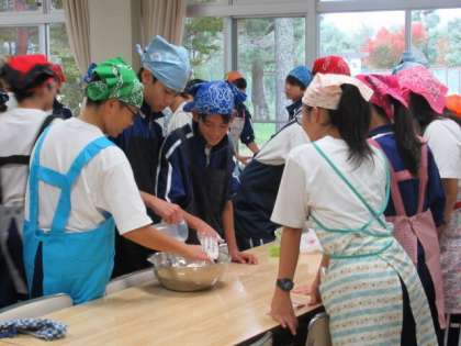 学園に到着しました。開園式の後少し休憩したら、うどん作りです。夕飯で食べるので皆必死です。