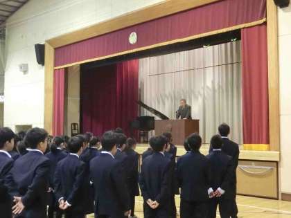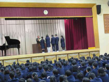 22日(木)終業式。校歌斉唱・校長先生の講話。整列完了までの静かさや話をしっかり聞いている姿に生徒一人一人の成長をみることができました。そのあと、区読書感想文コンクールの表彰があり、学級で通知表が手渡されました。