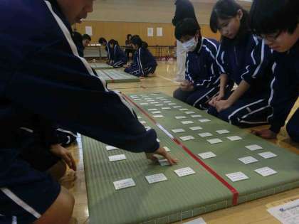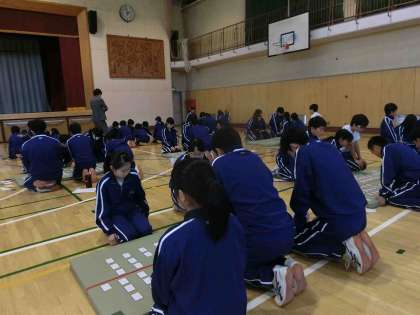 27日(金)体育館で百人一首大会が行われました。学級によっては、朝練習も行っていました。また、各自が十首以上覚えて、学年の先生に暗唱してもらうなどしっかりと取り組んでいました。当日保護者の方も大勢見学してくださっていました。