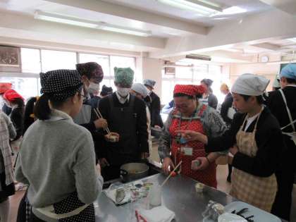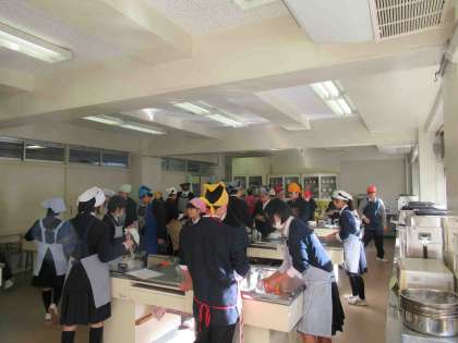13日(月)から1年生の家庭科で調理実習が各クラス2回ずつ行われます。第1回目は「かぼちゃのそぼろあん」を作りました。各授業に学校運営委員会のご協力で3名ずつお手伝いをしていただきました。協力のかいあって、時間内で片付けまで終了しました。