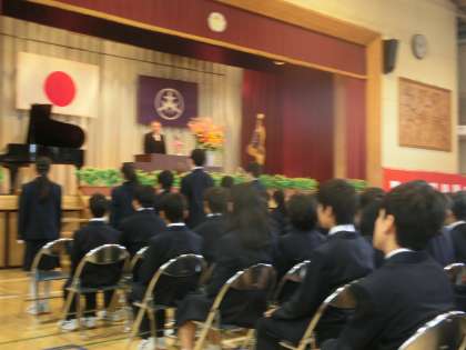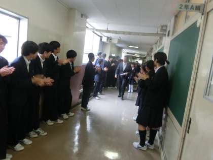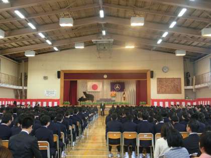 7日(金)、平成29年度第70回入学式が行われ、男子145名、女子117名、計262名の新入生を迎えることができました。新入生と保護者が昨年度より大幅に増加したため、2年生は校舎廊下で新入生を歓迎しました。新入生は、式が始まり、担任の先生から呼名を受けると大きな声で返事をして、中学生の意気込みを表していました。