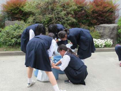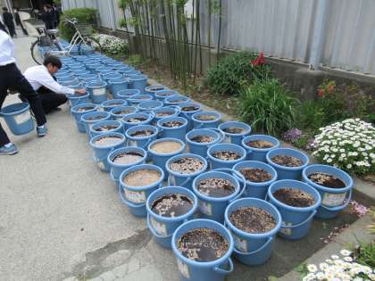 3年生技術科の栽培では、今年度稲作を行います。「バケツで稲つくり」として各自1つのバケツを利用して土、水を入れ稲を育てていきます。