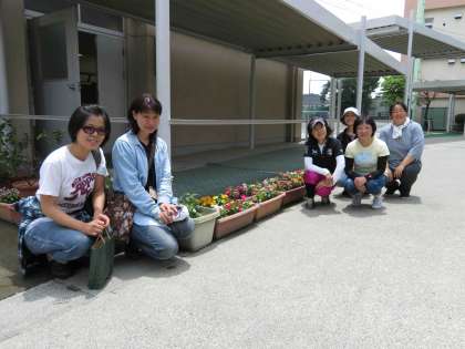 本日午前中、PTA文化厚生委員会のメンバーを中心に玄関周りの花壇の植え替え作業が行われました。