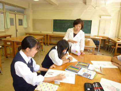 (写真は、都立農業高等学校の先生を招いての「服飾デザインの授業」の様子です。)