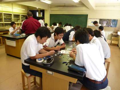 サレジオ高専からは、現役の学生さんも大勢お手伝いに来てくださり、電気の発生とモーターについての講義をしていただいたあと、実際に車の模型を組み立てる作業を行いました。