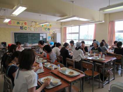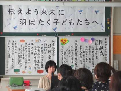 5日(水)第1回家庭教育学級が行われました。今年度の千歳中学校のスローガンは「伝えよう未来に 羽ばたく子供たちへ」として年3回開催されます。今回は太子堂調理場から場長の小川様と管理栄養士の田中様をお招きし、”成長期の子供に求められる食事と栄養”をテーマに講演していただき、その後、給食試食会を行いました。