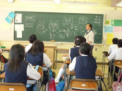 総合工科高校の先生を招いての授業は、「動物のイラストを描いてみよう!」でした。生徒の代表が前に出て、黒板に動物の絵を描きました。動物の絵を描くときには、その特徴を描けばその動物に見えるということを先生から教えていただき、なるほど…とうなずいた人たちも多かったようです。