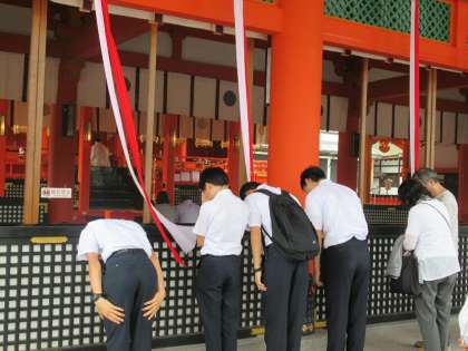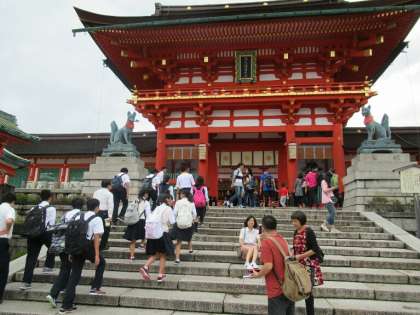 雲は厚いですが、雨はあがり、見学に傘は必要なくなりました。多くの班が訪れる伏見稲荷大社は外国人の姿もたくさんみられました。