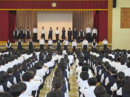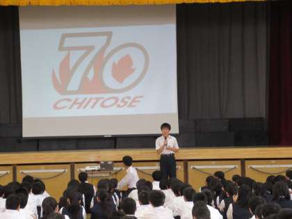 11日(水)生徒会朝礼が行われました。6日の生徒会役員選挙で選ばれた新生徒会役員の紹介と旧生徒会役員のあいさつを行いました。また、1学期に募集した70周年記念ロゴの発表がありました。