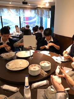 8日(木)3年生は中学校生活最後の校外学習に出かけました。横浜周辺を班ごとにテーマに沿って見学し、昼は全員で餃子、肉まん作りを体験します。天気はあいにくの雨ですが室内での作業は熱気に包まれています。