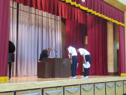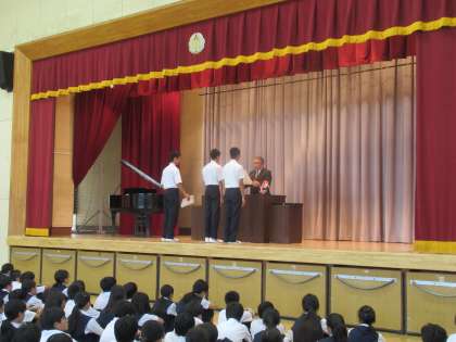 20日(金) 1学期終業式が行いました。1学期を振り返り、夏休みの生活についての注意がありました。44日間という長い夏休みを安全に配慮し、誘惑に負けず、自らが立てた目標の達成に向けて充実した夏休みを送り、9月3日始業式に元気に会うことを約束しました。次に学級員会からの表彰、野球部・陸上部の表彰がありました。その後、教室に戻り担任の先生から通知表をもらいました。