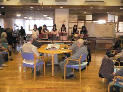 12/11(土)、日頃からステップで活動している生徒たちが、芦花ホームの訪問を行い、ご老人達と楽しいひと時を過ごしました。写真は、学芸発表会でも披露してくれた「ハンドベル」の演奏の様子です。