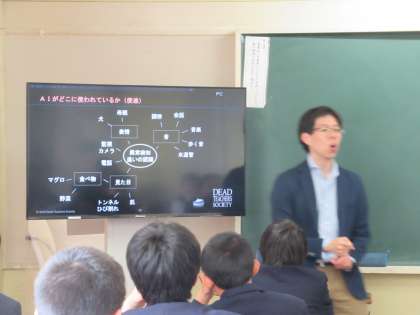 19日(金)2年生の授業でゲストティーチャーをお招きしSDGsを扱った授業を理科の時間で行いました。冒頭にAIについて講義を受け、班ごとにテーマ・方向性を決め、話し合いを進めていきました。
