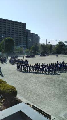 運動会に向けての朝練習が始まりました。今日は3年生はムカデの練習をしています。