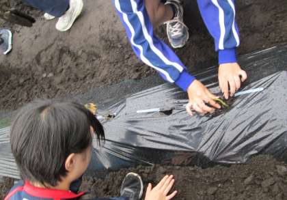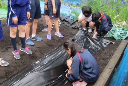 7日(金) 校庭の南西にある敷地を農園として活用しようと生徒会がボランティアを呼びかけて苗の植え付けを行いました。