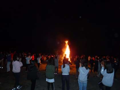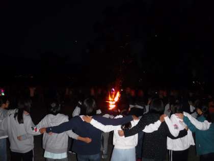 2日目のレクはキャンプファイアです。火之神から与えられた火でつけた薪を囲み、最後の夜を歌と踊りでもりあげていました。