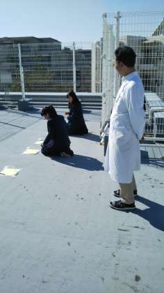 校内では、久しぶりの晴天のおかげで、3年生が屋上で理科の実験をしていました。