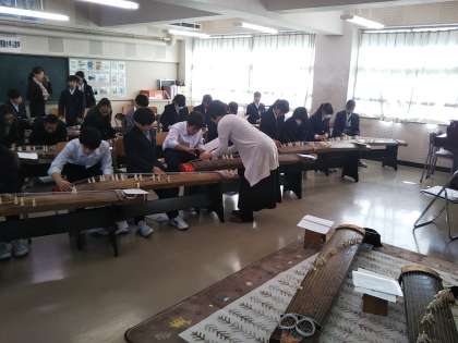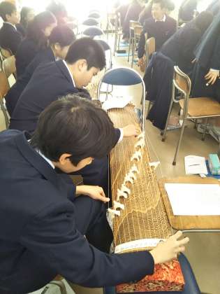 一年生の音楽授業において、日本の伝統音楽に触れるということで、外部から講師をお招きして、琴を体験しました。