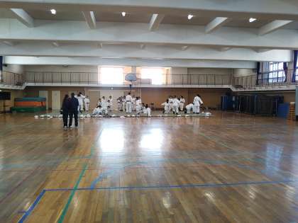 格技室では、女子体育で柔道を行っていました。柔道着をしっかりと着こなしている姿は立派に見えました。