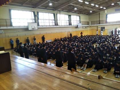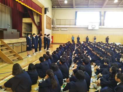 本日は、体育館にて朝礼を実施し、各委員長より活動報告がありました