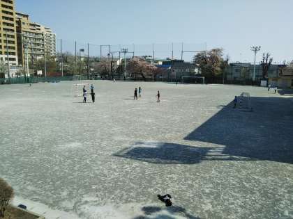 暖かな日差しの中、多くの人が校庭で遊んでいます。