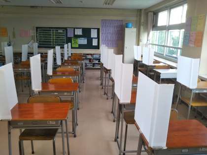 さて、来週からは6時間授業になります。課題となったパーティションを工夫をしたり、校長室前のブラックボードではコロナの注意喚起をしています。