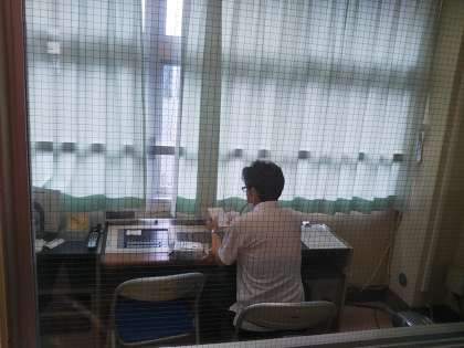 終業式は教室で放送集会。放送室で校長先生が話し、それを生徒は教室で聞いていました。