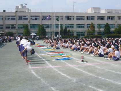 (写真右は、閉会式で全校生徒の前で礼をして全校生徒から拍手をもらう運動会実行委員の様子です。)