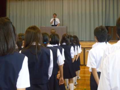 今朝、全校朝会が行われ、校長先生から運動会についてのお話がありました。学年種目やダンス、集団行動がすばらしかったこと、そしてこれらの種目を通じて学んだ、「ルールを守る」「自分の責任を果たす」「仲間を信じる」を、授業や部活、日常生活にも生かして欲しいということでした。