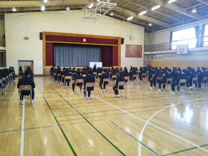 新型コロナウィルス感染症対策として、学年を2つにすることで密をさけ、体育館で実施しました。